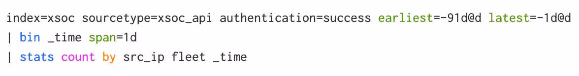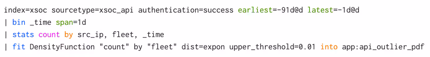 In the following example we are measuring user behavior over each day (span=1d), training with 90 days of history (earliest=-91d@d latest=-1d@d), and splitting the results by an entity (src_ip) and peer group (fleet).