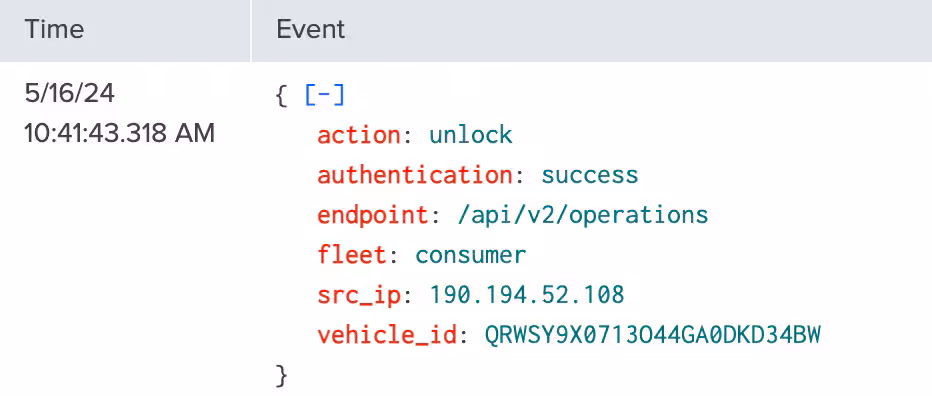 The first step is to develop the base search that will be used to train the ML model. Here you can see a sample event showing an API request to remotely unlock a vehicle.
