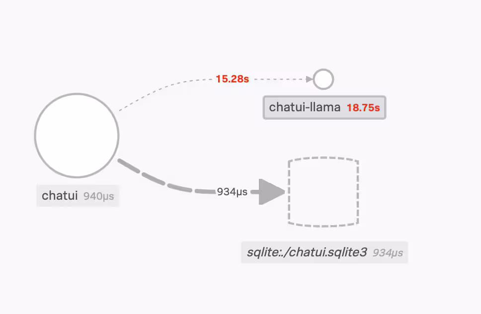 As an example of the visibility that you can get, here’s our example organization’s chat platform running on a normal day. The frontend talks to the database backend and also to the Large Language Model service, providing responses as needed.