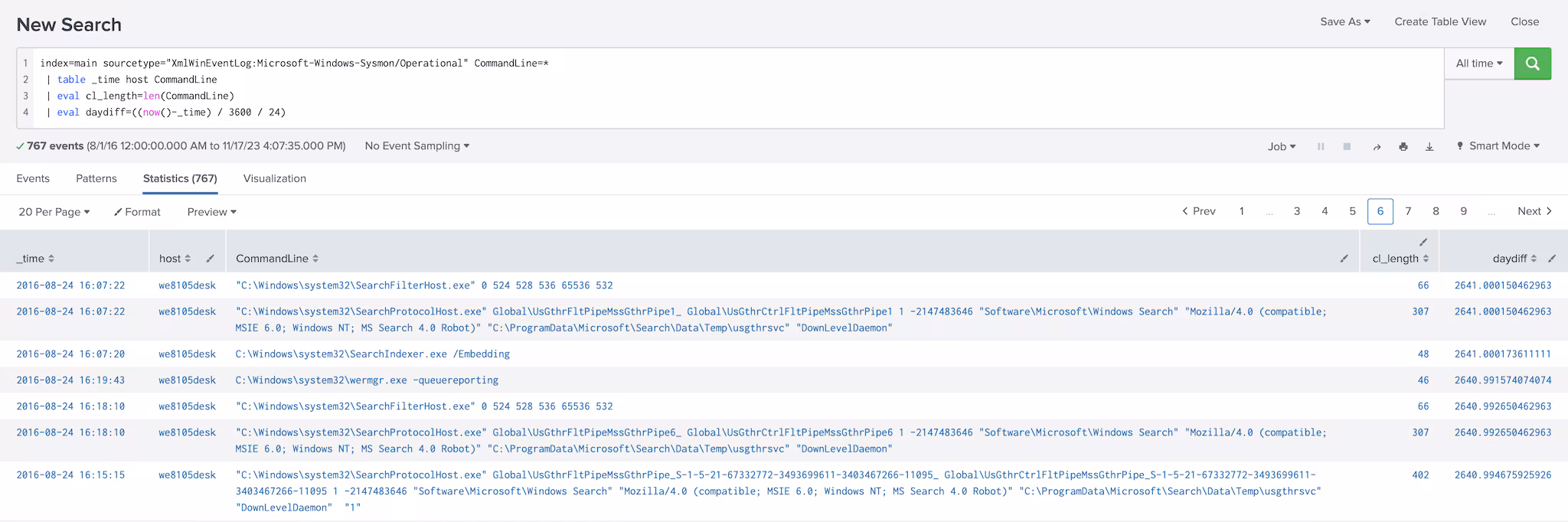 Another way eval can be used for hunting is by calculating the time elapsed between different events and applying functions to date/time values. Continuing with my earlier hypothesis and applying the sort command, I can see that I have a long command line string on a specific host and I want to calculate how many days have passed since that command line string of interest executed on the system.