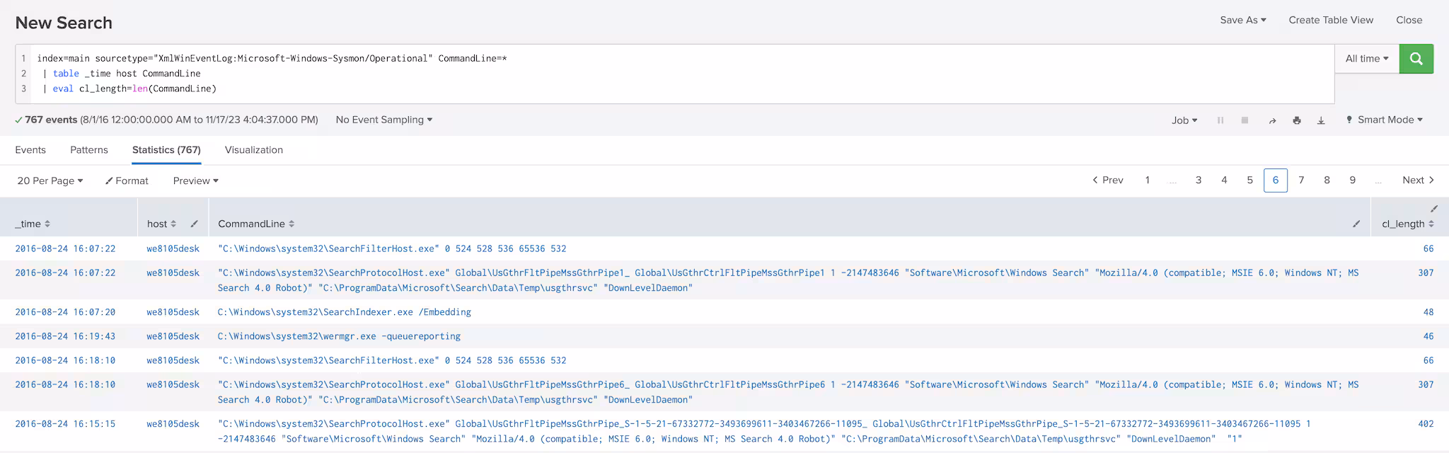 To determine the length of a string, I will use eval to define a new field that I will call cl_length and then I will call a function. The output of that function will reside within our new field. My function will be len(CommandLine) where len is short for the length of the field in parenthesis, in this case the field CommandLine.