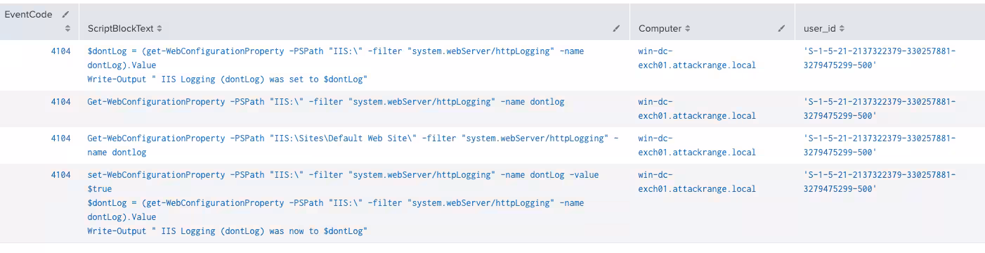 `powershell` EventCode=4104 ScriptBlockText IN("*get-WebConfigurationProperty*","*Set-ItemProperty*") AND ScriptBlockText IN ("*httpLogging*","*Logfile.enabled*") AND ScriptBlockText IN ("*dontLog*", "*false*") | stats count min(_time) as firstTime max(_time) as lastTime by EventCode ScriptBlockText Computer user_id