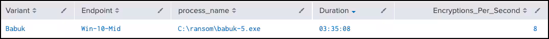 As you can see, LockBit lived up to its own hype and was the quickest to encrypt of all the ransomware families we tested. We listed the median duration, as some families had one or two samples that would skew the average duration. For example, LockBit had the fastest sample coming in at four minutes and nine seconds (fig. 5). Babuk was a close second but had one sample that was the slowest of all samples tested, which took more than three and a half hours (fig. 6).