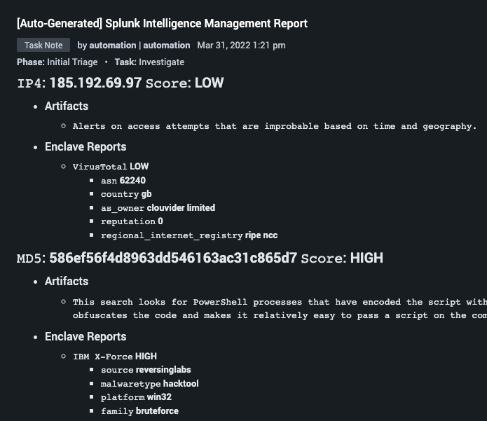 It then extracts hundreds of indicators from the Notable, enriches them through SplunkⓇ Intelligence Management, and marks key details as evidence. Splunk Intelligence Management shows which indicators from the event have scores and what the various sources say about those indicators as you can see in this screenshot.