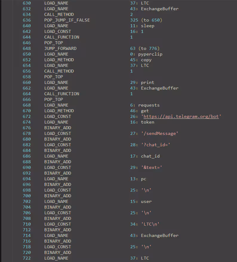 After capturing screenshots of the compromised host and extracting potential cryptocurrency wallet addresses from the clipboard, the malware sends this data to its C2 server, which operates via a Telegram bot. Figure 13 provides a screenshot of the Python bytecode in MicrosoftPrt.exe, showing the process of preparing the collected data for transmission to the Telegram bot.
