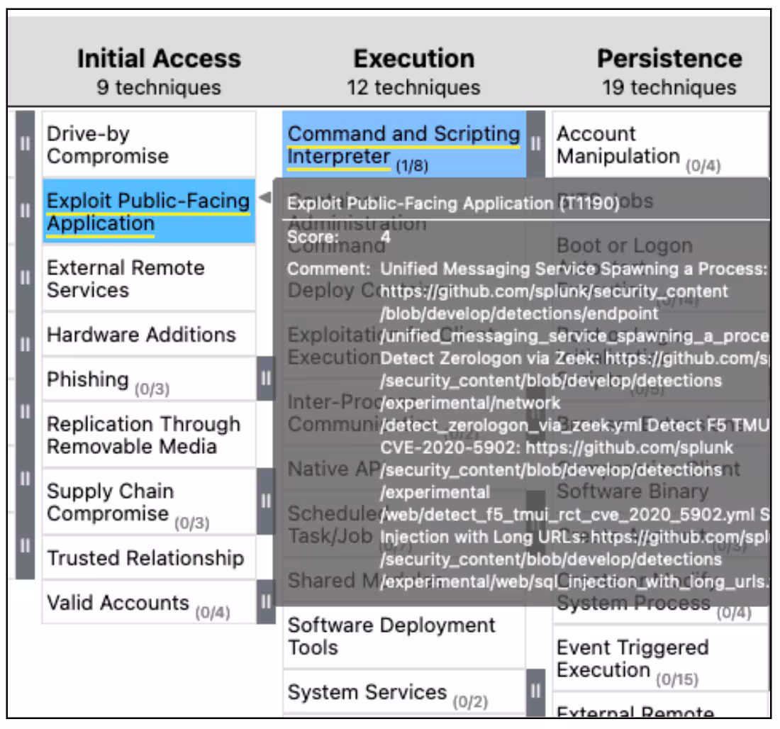 Remember that bonus feature we mentioned earlier? Let’s take a look at what that would look like. The color gradient is dependent on the number of ESCU detections for the specific ATT&CK technique. Additionally, you can view direct links to the relevant ESCU detections in the comments section. There is also plenty of room to customize the output via the output template in the repository, and you’re all set.