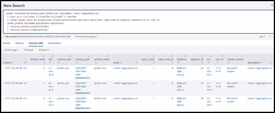 `sysmon` EventCode=22 process_name IN ("python.exe", "cmd.exe", "rundll32.exe","powershell.exe", "pwsh.exe") QueryName= "router.huggingface.co"
