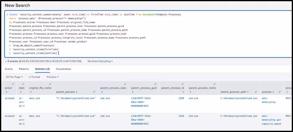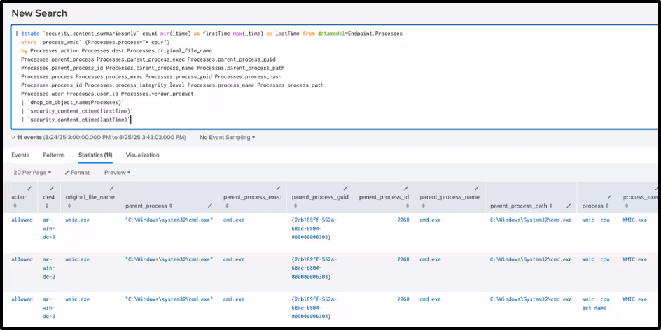 The following analytic detects the use of WMIC (Windows Management Instrumentation Command-line) for CPU discovery, often executed with commands such as “wmic cpu get name” This behavior is commonly associated with reconnaissance, where adversaries seek to gather details about system hardware, assess processing power, or determine if the environment is virtualized.