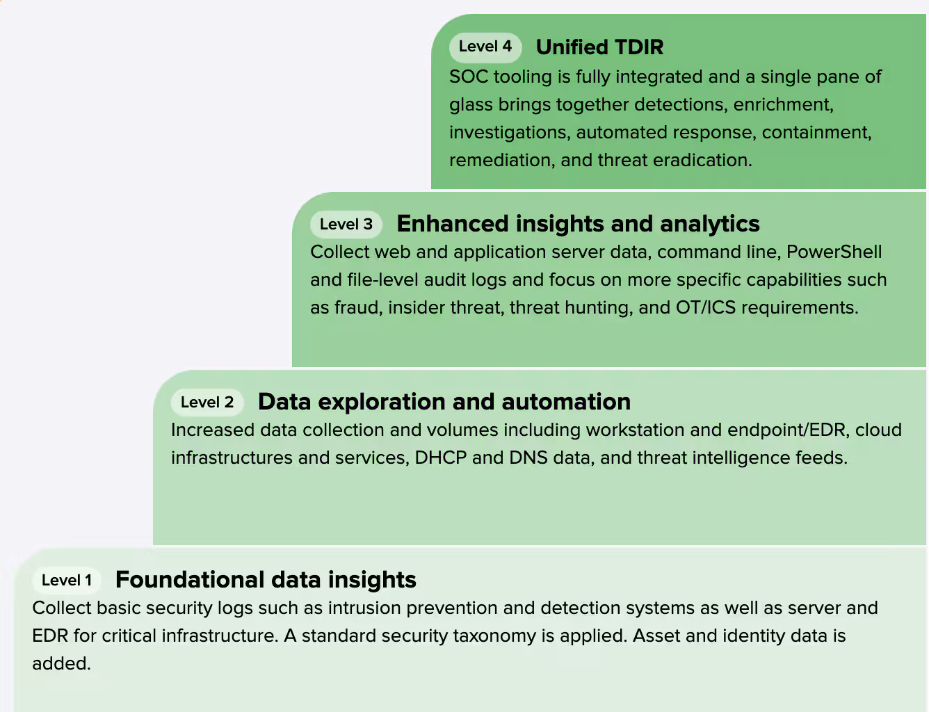 Level 4 - Unified TDIR The availability of these data sources, along with more advanced automation, minimizes visibility gaps and enables the implementation of unified, risk-based threat detection, investigation and response (TDIR) workflows within the SOC and the software development life cycle.