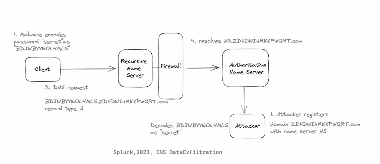 - The malware generates a DNS request to one of the attacker’s registered domains by encapsulating encoded information in the subdomain text.