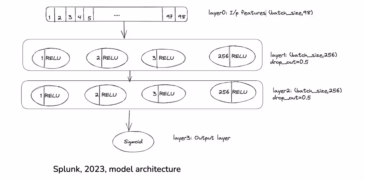 Since we tokenize the text as described above, we do not need to specifically create vocabularies or embedding layers. The model architecture contains 2 dense layers with 256 units each. The dense layers have ‘relu’ activation function and a drop out of 0.5 to avoid overfitting. The final layer of the model is a single dense layer with a sigmoid activation function that generates probability scores indicating how likely the input is exfiltration/ non-exfiltration.