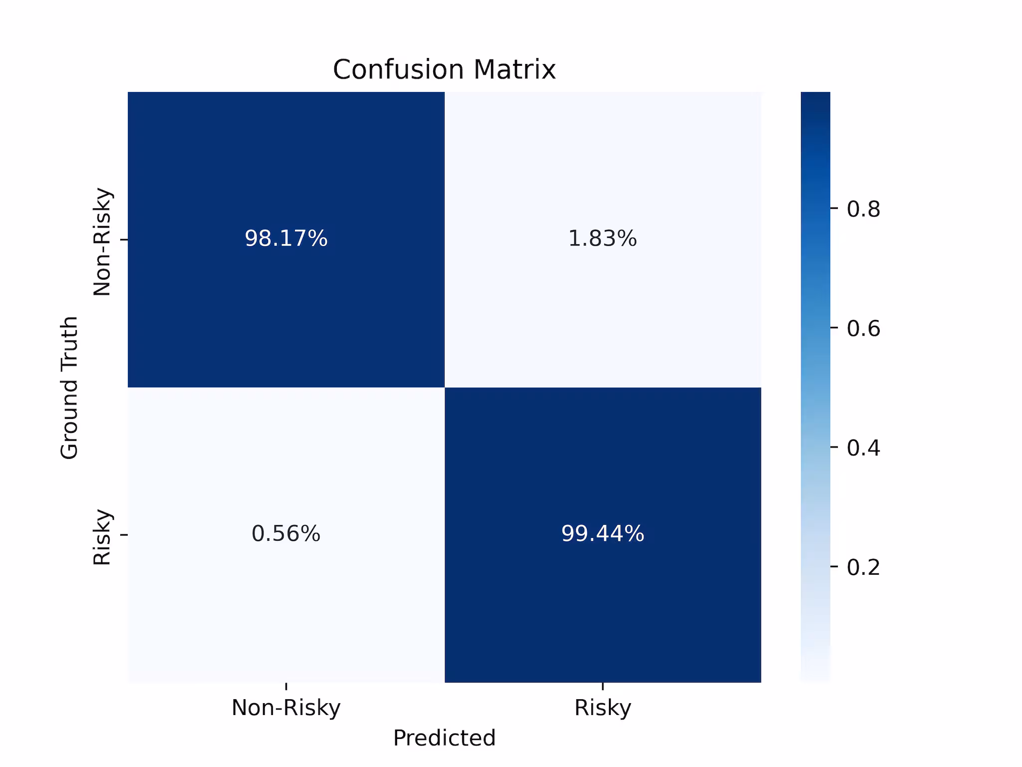 The results are confirmed by the confusion matrix. The lower left quadrant is of prime importance for any security-based classification problems. Almost all risky detections are caught with a false negative rate of only 0.56%. The false positive rate is also very low at only 1.83% which is an important metric from the usability perspective. In security critical scenarios, incidents of interest are rare and even a modest false positive rate can render the system useless by fatiguing the user with a high number of false alarms, so we need to be careful while designing such systems so that we keep the false positive rate low.