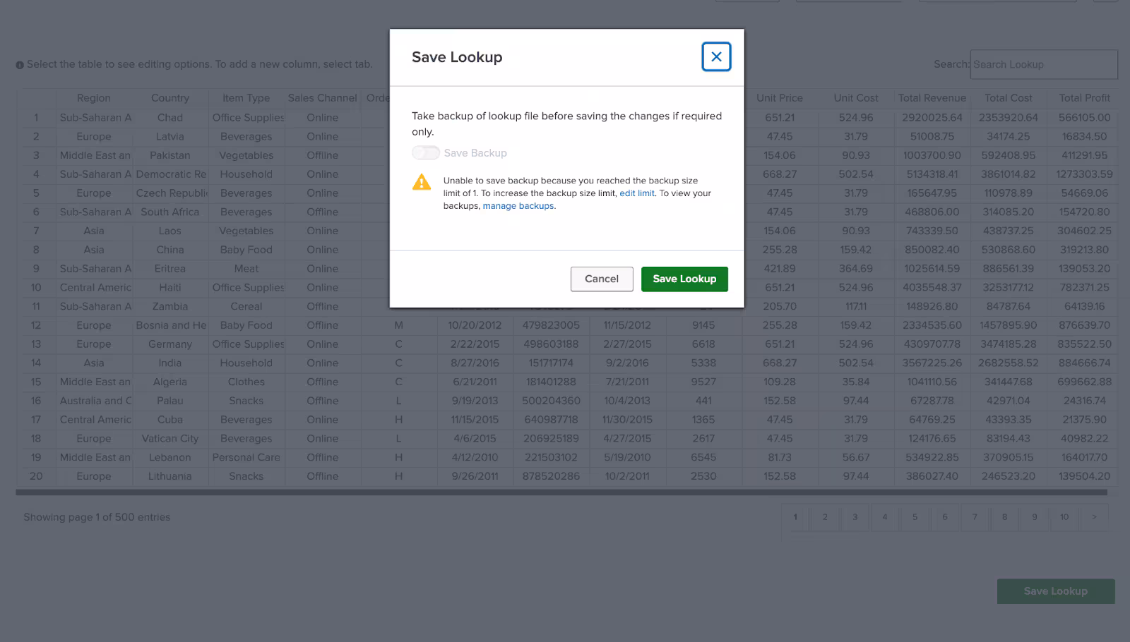 Another development since the earlier version of the app is the option to save a backup before saving changes to a lookup file. Before the 4.0.1 release, the app automatically saved a backup for every change made to a lookup file. While some users prefer this, others prefer to save backups as they deem necessary. They want to limit unwanted backups that could contribute to lower disk space. With the 4.0.1 release, users can now save backups at their own discretion when they save changes to a lookup file.
