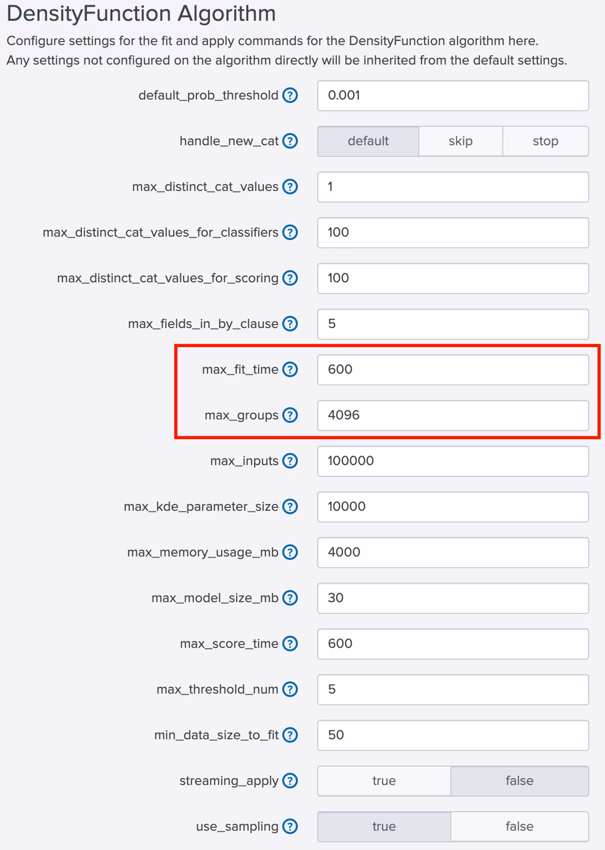 For large enterprises, for example where more than 1,000 users will actively run Splunk searches, training the baseline model might take significant computing resources and might require a dedicated search head. Default settings of this detection’s underlying DensityFunction algorithm within MLTK App may need to increase to achieve optimal performance as described in the section Configuring DensityFunction parameters section in the manual for MLTK App, especially for these parameters: