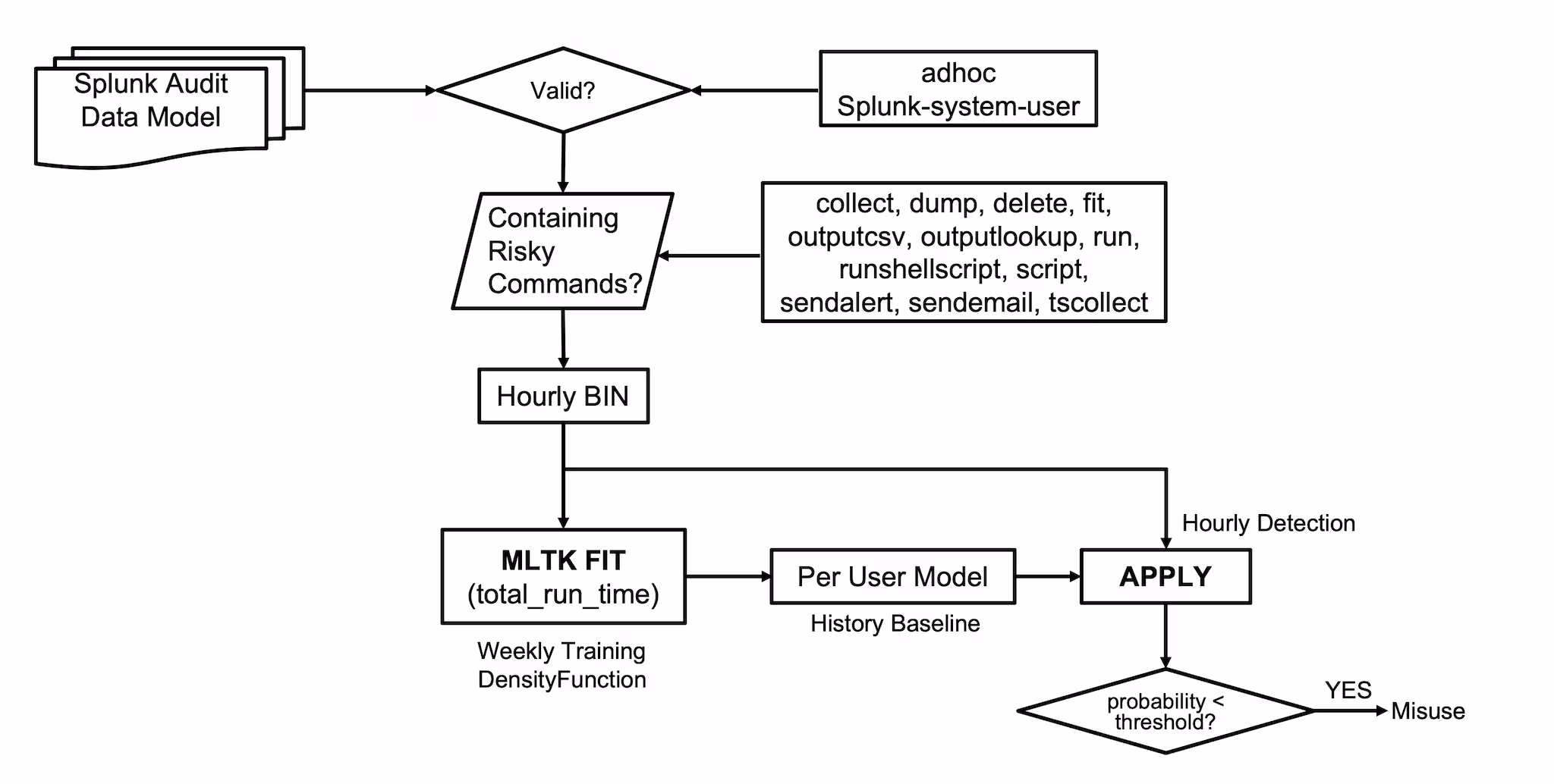 This is accomplished by using the time spent executing one of these risky commands as a proxy for misuse/abuse of interest during an investigation and/or hunting. The detection builds a model utilizing the MLTK DensityFunction algorithm on Splunk app audit log data. The model is trained from users' historical reference of running the risky commands, and then the total search run time of executing these commands in each hour is aggregated as an indicator of user behavior to perform anomaly detection.