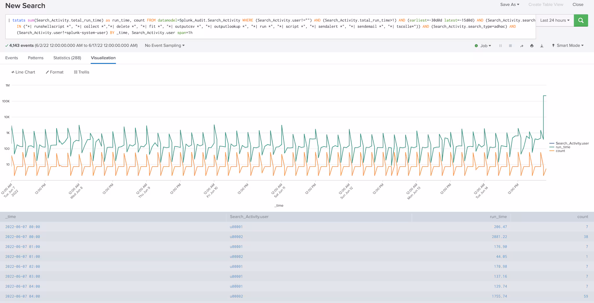 In our detection, the ‘total_run_time’ of past 7-day data is fed to the MLTK app ‘FIT’ command to train a baseline model of user behavior, along with ‘user’ as a ‘by’ clause to create per-user models. The model can then be used to monitor new search activities continuously.