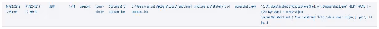 In the following graphic, you can see the next phases after .zip extraction and .lnk file execution. Also, note how the execution of the .lnk file is followed by the spawning of a powershell.exe process, then the download and execution of a powershell file (.ps1).