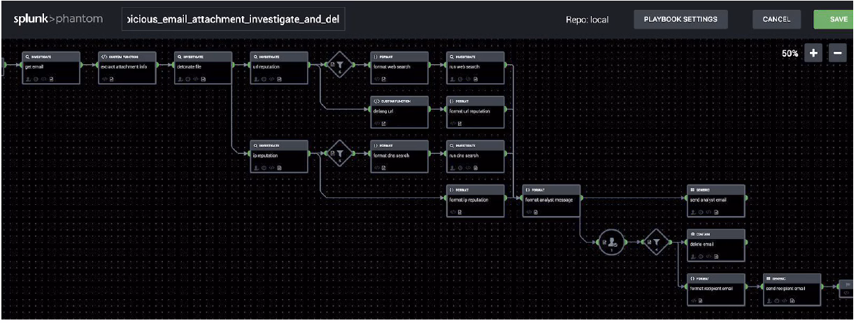The following screen capture shows an example of an email payload triage performed via Splunk Phantom. This playbook combines several log sources and defense technologies to triage the file and orchestrate a response. Some of the components used below include file extraction, sandbox detonation, IP reputation check, DNS checks, and URL checks, and more.