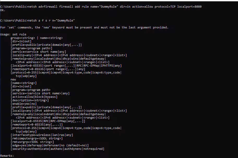 netsh advfirewall firewall delet rule name="Br3akp0int-DummyRule"