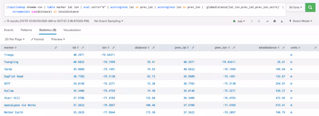 Let’s say we’re planning a road trip to visit some of the top craft breweries in the Mid Atlantic United States, and fed that data into Splunk. We want to compute the distance between waypoints and the total distance we’re traveling (so we know how much fuel to put into our personal jetpack). We apply autoregress to both latitude and longitude in order to iterate through the waypoints, then perform any further applicable calculations, such as `globedistance()` or streamstats.