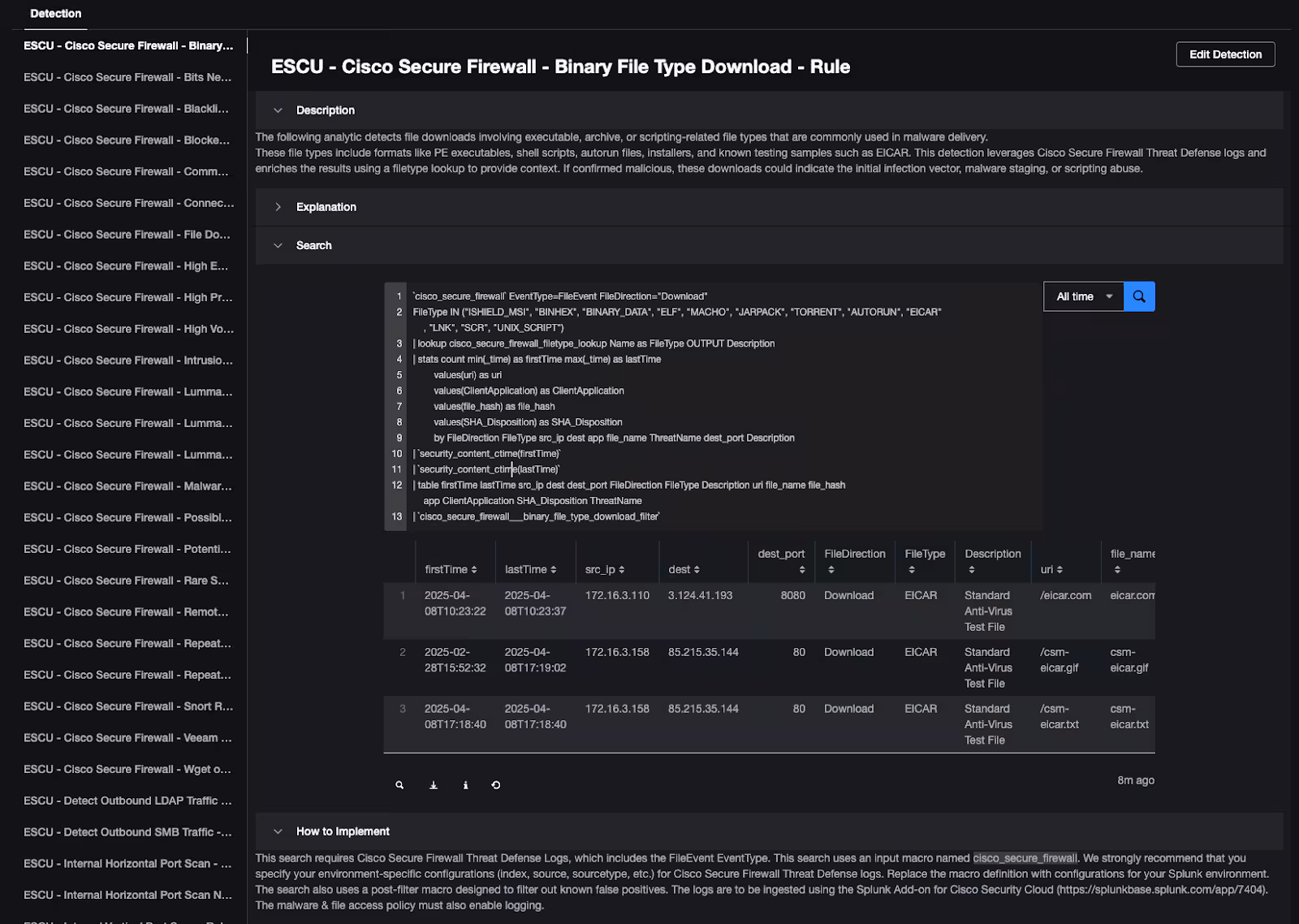 ⚠️ Note: Before running this detection review each detection is annotated with implementation guidance, including which data models, input macro it relies on. Please make sure: - The relevant data models are accelerated and populated with data. - The input macro (e.g., `cisco_secure_firewall` ) is correctly configured to point to the right index(es) where your data lives. Read more about configuring macros. - Review the relevant information regarding how this search is to be run, any specific time windows are mentioned and if there is a baseline needed for this detection to work.