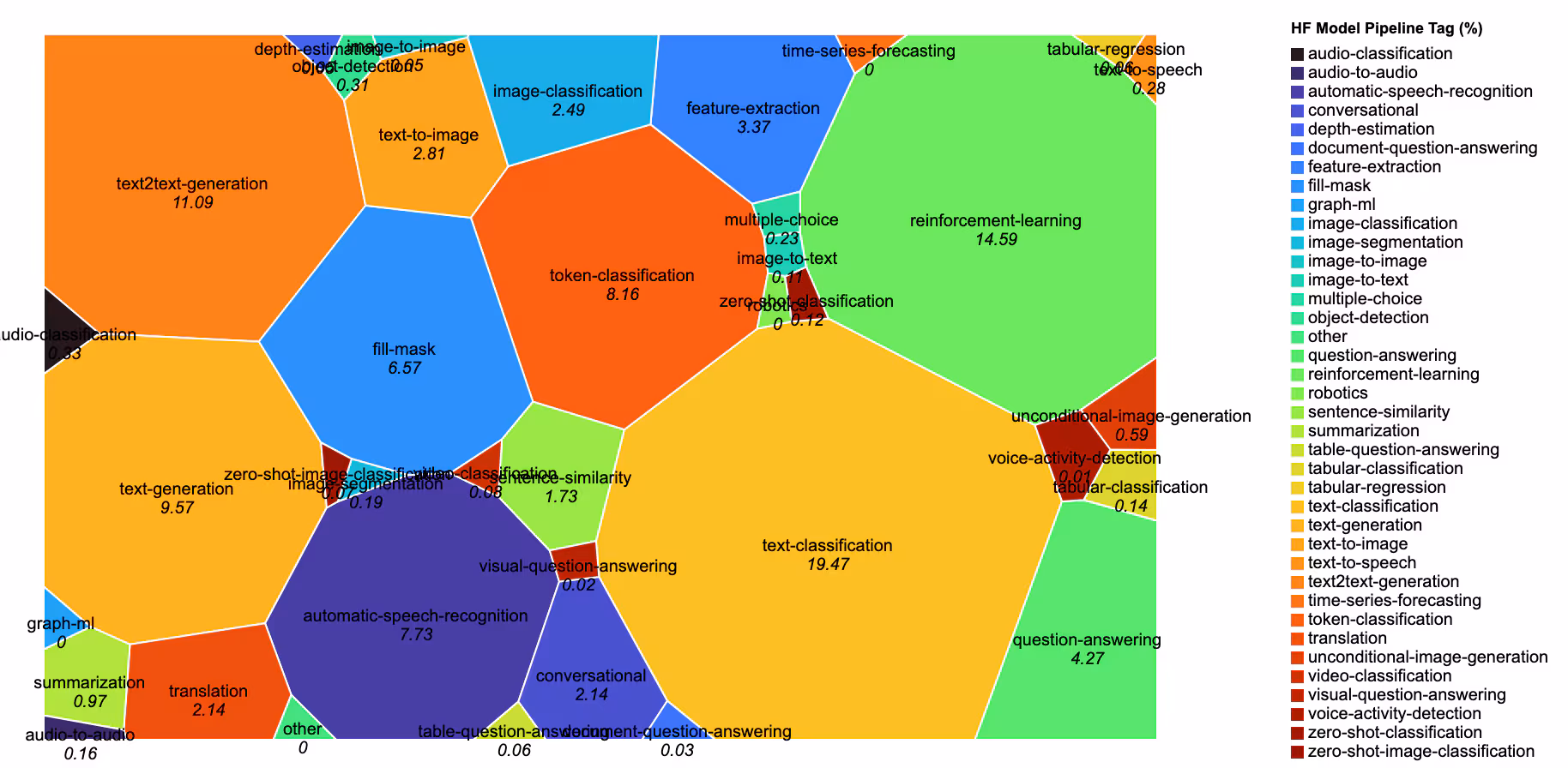 As of late March 2023, the HuggingFace landscape consisted of ~148,000 publicly-accessible models and datasets. Here, models are visualized proportionately to their percentage, based on the pipeline tags that describe their functionality:
