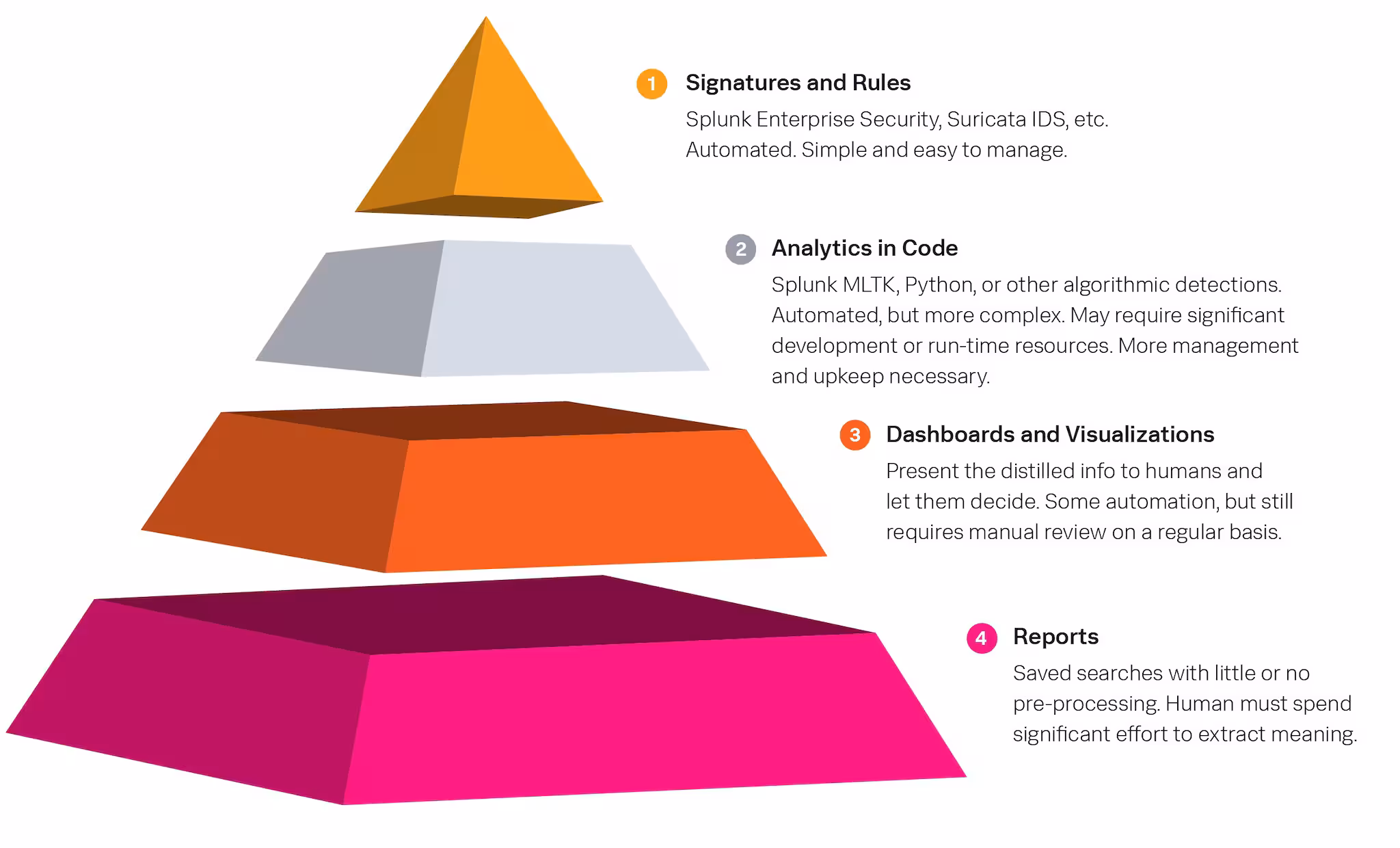 At the top of the hierarchy, you’ll find IDS signatures and SIEM rules. These require no human input to generate alerts and are easier to manage than analytics written in code. As a result, they are the preferred choice for automated detection when feasible.