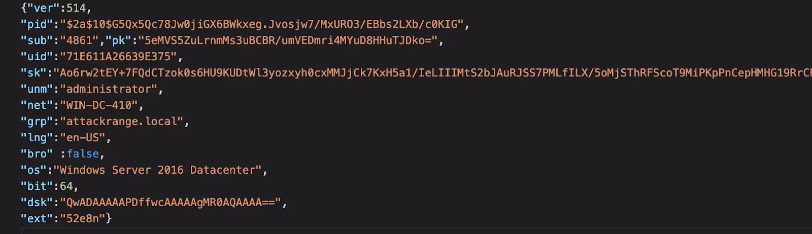 REvil ransomware will also gather some information about the compromised machine like the computer name, user name, language used by the machine, product name, operating system, network group, OS version, and file extension it generates for the encrypted files. Below is the example of the information in json format.