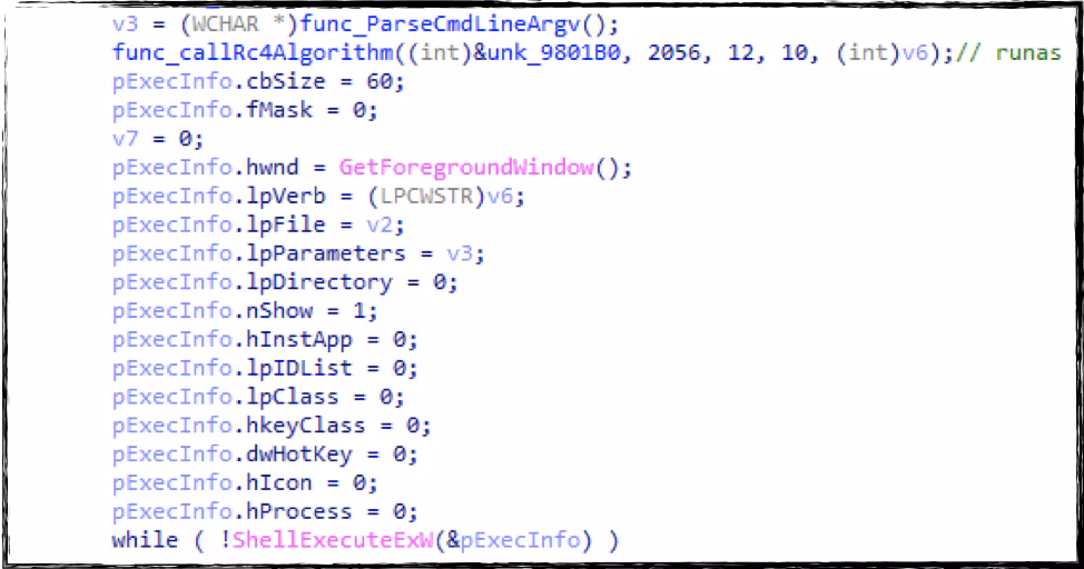 REvil uses RC4 encryption/decryption algorithm to decrypt its notable strings and its configuration file. REvil does this by parsing the 0x20 bytes RC4 key placed in one of its sections and verifying the checksum hash of the encrypted config file in its code body. This configuration file (JSON format) contains information and conditions on how it will encrypt the files in the compromised machine.