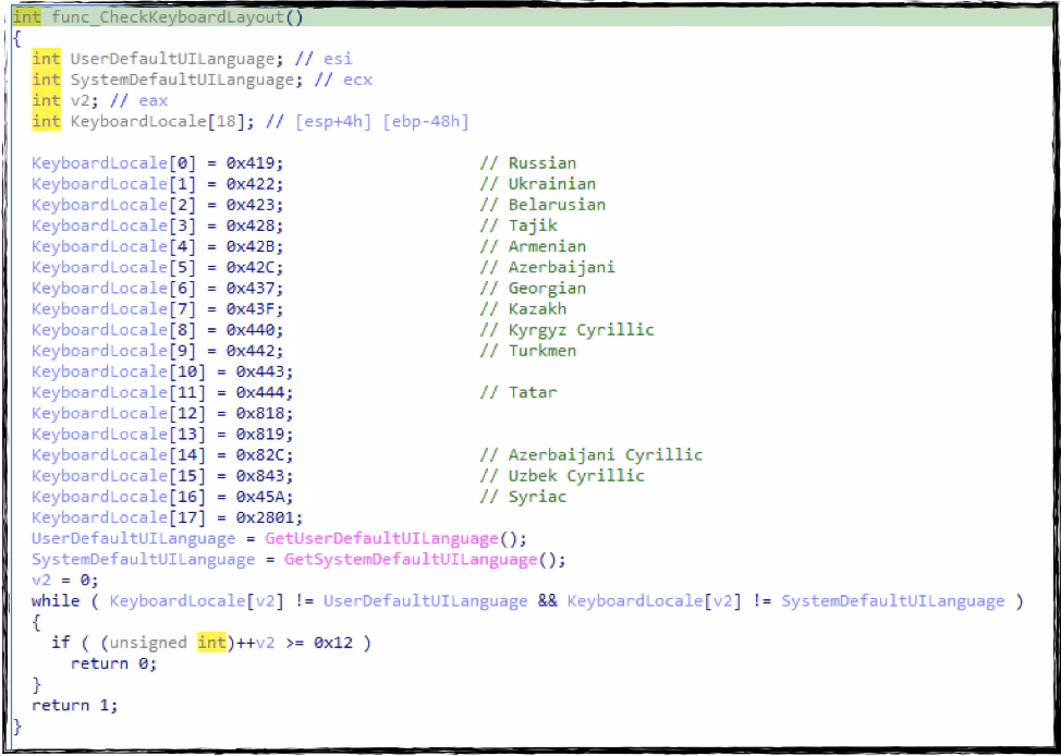 This ransomware also has a kill switch. It tries to avoid compromising a machine with a specific keyboard layout and languages like (Russian, Ukrainian, Belarusian, and many more) as shown in the screenshot below.