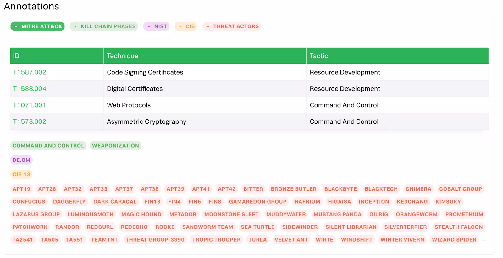 Each detection in the analytic story comes with metadata mapping to the MITRE ATT&CK framework, providing security teams with context about the adversary tactics being employed.
