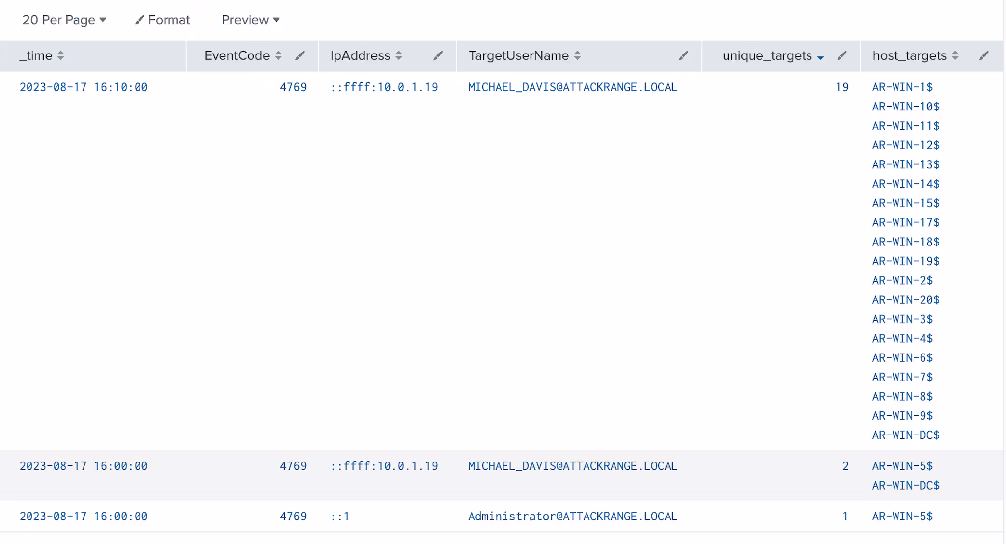 | stats dc(Computer) AS unique_targets values(Computer) as host_targets by _time, EventCode, IpAddress,