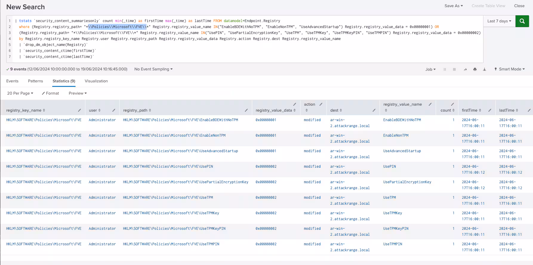where (Registry.registry_path= "*\\Policies\\Microsoft\\FVE\\*" Registry.registry_value_name IN("EnableBDEWithNoTPM", "EnableNonTPM", "UseAdvancedStartup") Registry.registry_value_data = 0x00000001) OR