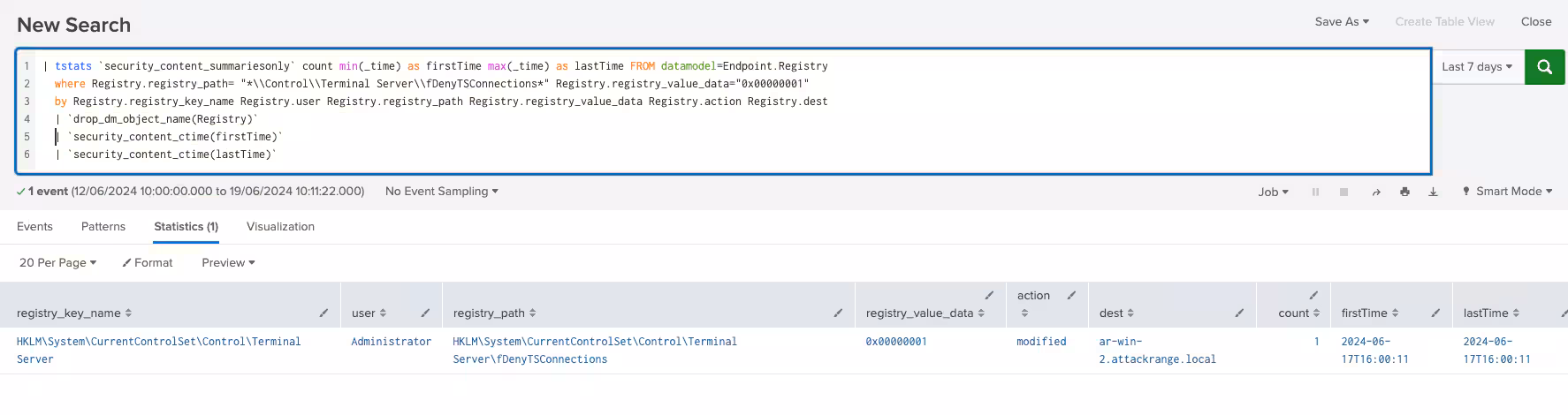 where Registry.registry_path= "*\\Control\\Terminal Server\\fDenyTSConnections*" Registry.registry_value_data="0x00000001"
