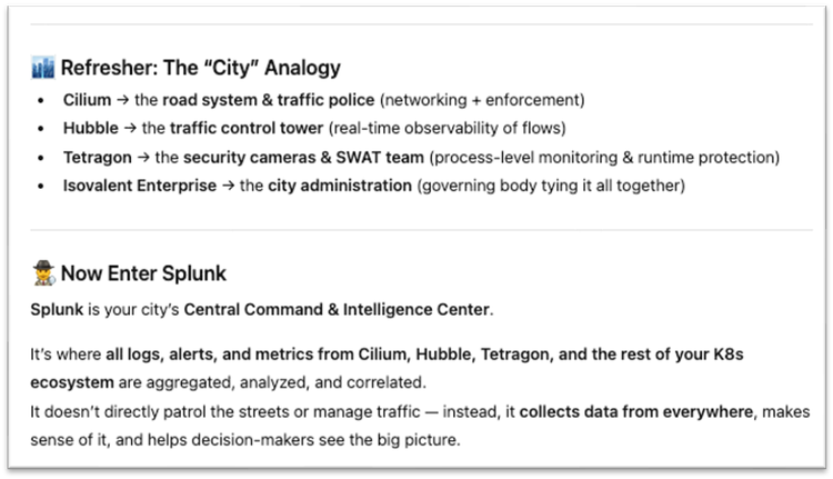 By integrating Cisco Isovalent’s stack—built on Cilium and Tetragon—with analytics platforms like Splunk, organizations can finally bridge this gap between network visibility and security observability. Cisco Isovalent brings eBPF-powered insights directly from the Linux kernel, providing a unified, context-rich view of both network and runtime behavior inside Kubernetes clusters. This approach ties together workload identity, process activity, and network flow data into one coherent telemetry stream.