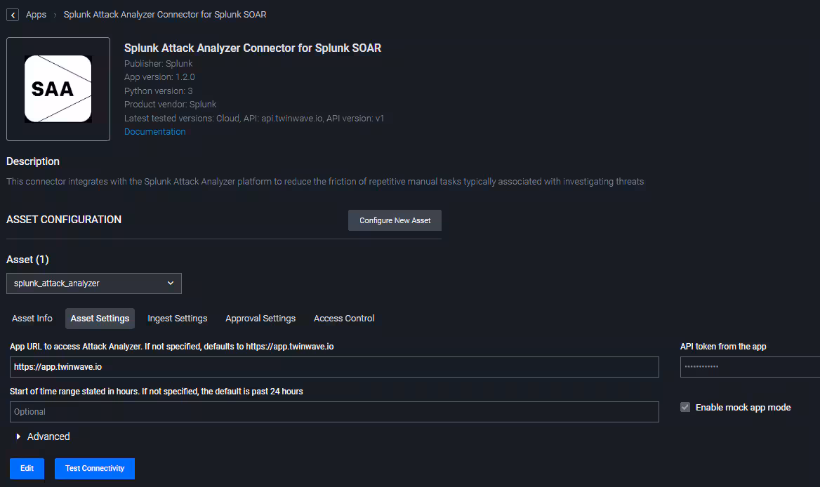 - Before using the playbook itself, you will first want to make sure that you have the Splunk Attack Analyzer Connector for Splunk SOAR downloaded and configured. This will ensure you are able to run the playbook and get the results all without needing to pivot out of Splunk SOAR.