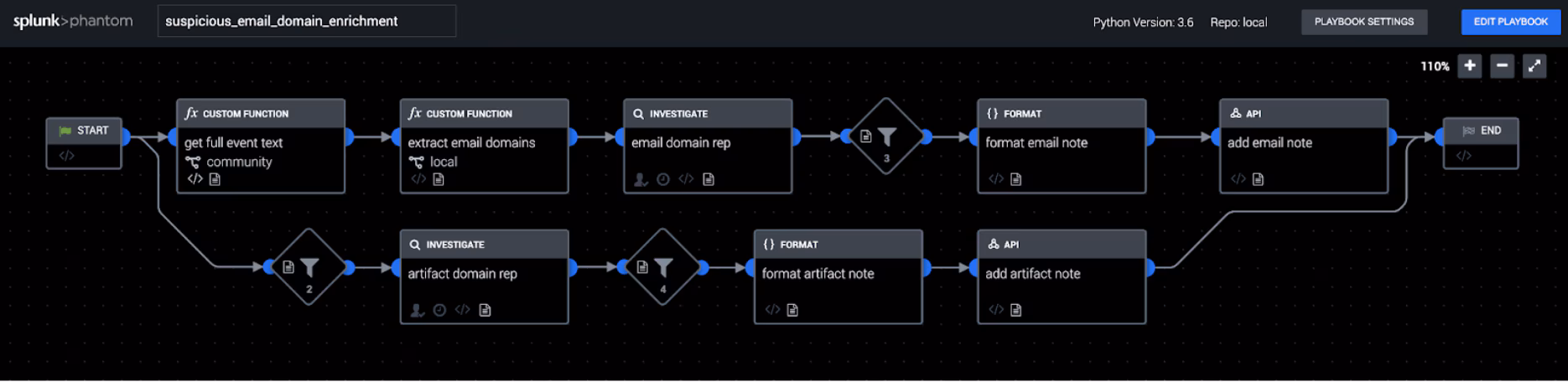 This playbook starts the enrichment process for a suspicious email, but there are many possibilities for additional response. For instance, domain names with risk scores higher than a certain threshold could be used to initiate a “block domain” or “delete email” action to prevent the user from following a link in a phishing email. Similarly, endpoint protection tools could be used to track activity on a potentially infected endpoint to monitor for users that may have followed a phishing link and been exposed to credential theft or client-side malware. We have another community playbook that uses the Network Resolution and Web data models in Splunk Enterprise to search for web traffic related to a phishing email, which would be a natural complement to this playbook.