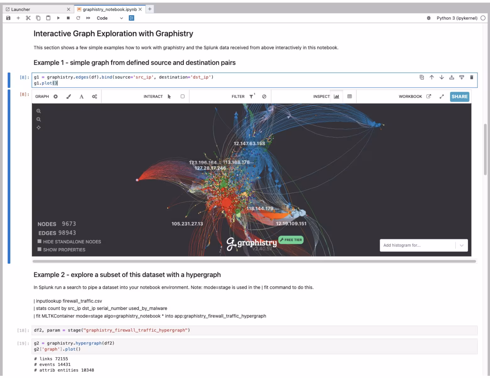 By combining Splunk and Graphistry, you can unlock new interactive graph explorations for your cybersecurity use cases and investigations. One way of getting started is by integrating the power of Graphistry into your data science workflows and using it straight from a Jupyter notebook (as shown in the screenshot above) which is available in DSDL. This comes with two main benefits: