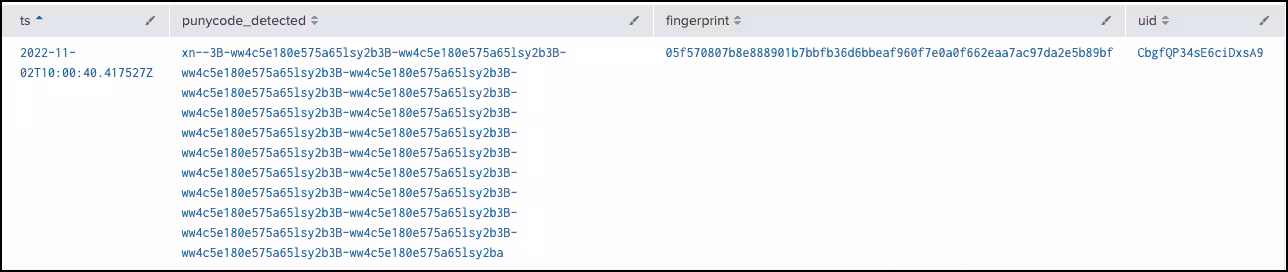Well, we can’t get lucky every time can we? We still see the othername:<unsupported> value, but now that we have the Name Constraints extension logged we can write a detection to look for the offending punycode.