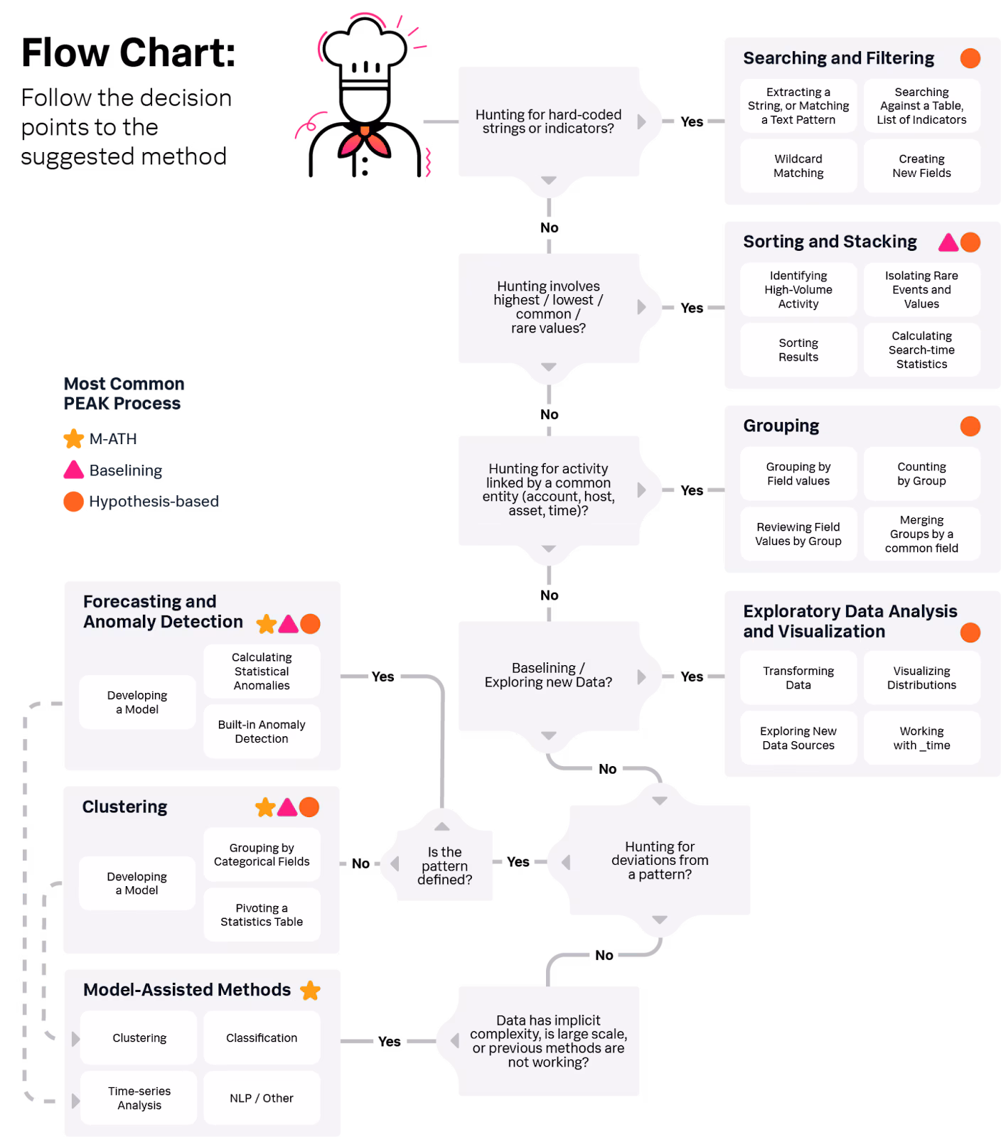 In addition to providing an organization and overview of the top hunting methods, The Threat Hunter's Cookbook features built-in guides, which tie back to our PEAK terminology, to help you select the optimal approach for every hunt.