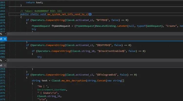 Like Agent Tesla malware, this Trojan Stealer boasts three distinct C2 servers for data exfiltration: FTP, SMTP, and Telegram. Depending on the enabled C2 server specified in its configuration, Snake Keylogger determines where to send the data. The configuration settings reveal the enabled C2 server using specific strings: