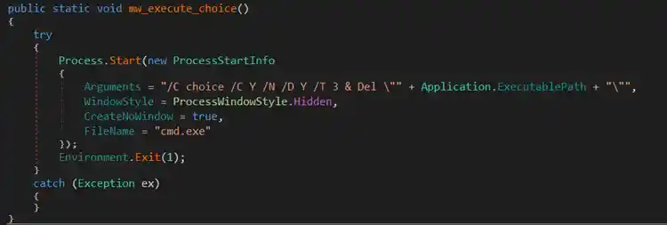 Snake Keylogger utilizes choice.exe, a native Windows executable tool, to prompt user choices. It leverages the "/T" parameter of this tool to set a timeout delay before executing its cleanup routine. This process involves deleting the file path associated with the process and terminating the process itself, serving as a methodical cleanup technique.