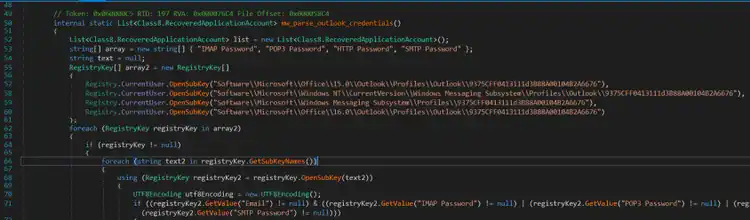 Snake Keylogger extends its reach to harvest Outlook profile information by querying into the system registry. This aims to extract potentially valuable data such as usernames and passwords associated with Outlook accounts. These credentials could serve as gateways for further malicious activities and persistence within the compromised host.