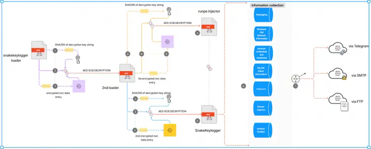 The decrypted data reveals yet another layer of complexity: an additional loader executable contains two AES-ECB encrypted .RSRC data entries, each with distinct decryption key strings. Upon successfully decrypting these entries, our analysis unveils their contents: a RUNPE injector module and the authentic Snake Keylogger malware.