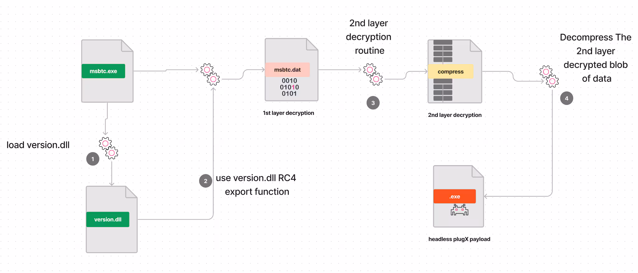 Automated Decryption: Once in place, it operates as a sophisticated decryption mechanism. It diligently decrypts the concealed, compressed payload and configuration files that constitute the heart of the PlugX malware. This decryption process is initiated seamlessly upon the execution of the legitimate "msbtc.exe."