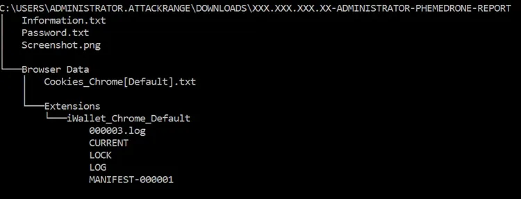 On the C2 server, we can observe how Phemedrone Stealer formats the stolen files from the compromised host. Figure 12 displays the file tree of the .zip archive received by the server from the Phemedrone Stealer client agent. This visualization illustrates the organized structure of the stolen data, aiding in analysis and understanding of the compromised system's contents.